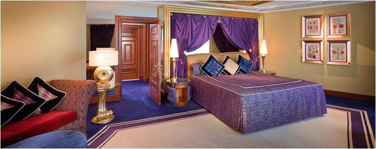 精彩的水舞噴泉及金碧輝煌的裝潢所吸引,旅館裏主要是以金、紅、藍三色為主,完美地呈現出阿拉伯風情。
