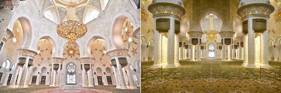 大圓拱頂覆蓋下的祈禱大廳,氣勢恢宏;近百根大理石圓柱上鑲嵌著數以千計的寶石、彩瓷和貝殼;刺繡般的牆飾在柔和的燈光下若隱若現;
