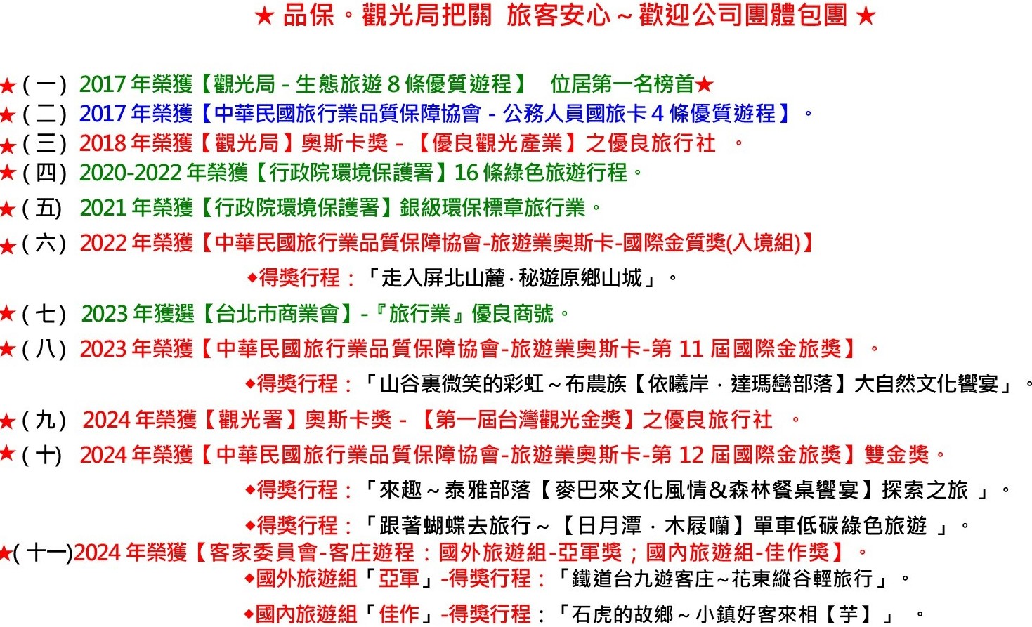 | ★ | 綠生活旅行社出團『有簽約』、『品保協會會員』、付款為『公司帳戶』「非個人名義或靠行」,旅客旅遊品質安全有保障。 |