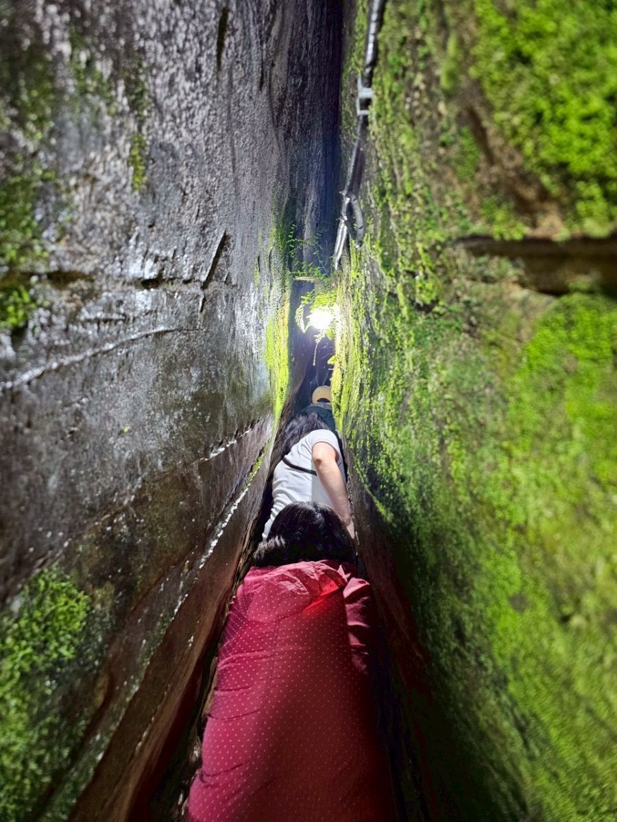 步道狹長空間幽秘,有時還需要側身才能通行,由洞口往內走,岩壁會越走越窄,簡直是考驗體型和膝蓋啊!