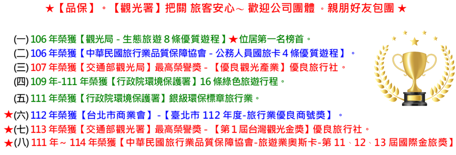 | ★ | 綠生活旅行社出團『有簽約』、『品保協會會員』、付款為『公司帳戶』「非個人名義或靠行」,旅客旅遊品質安全有保障。 |