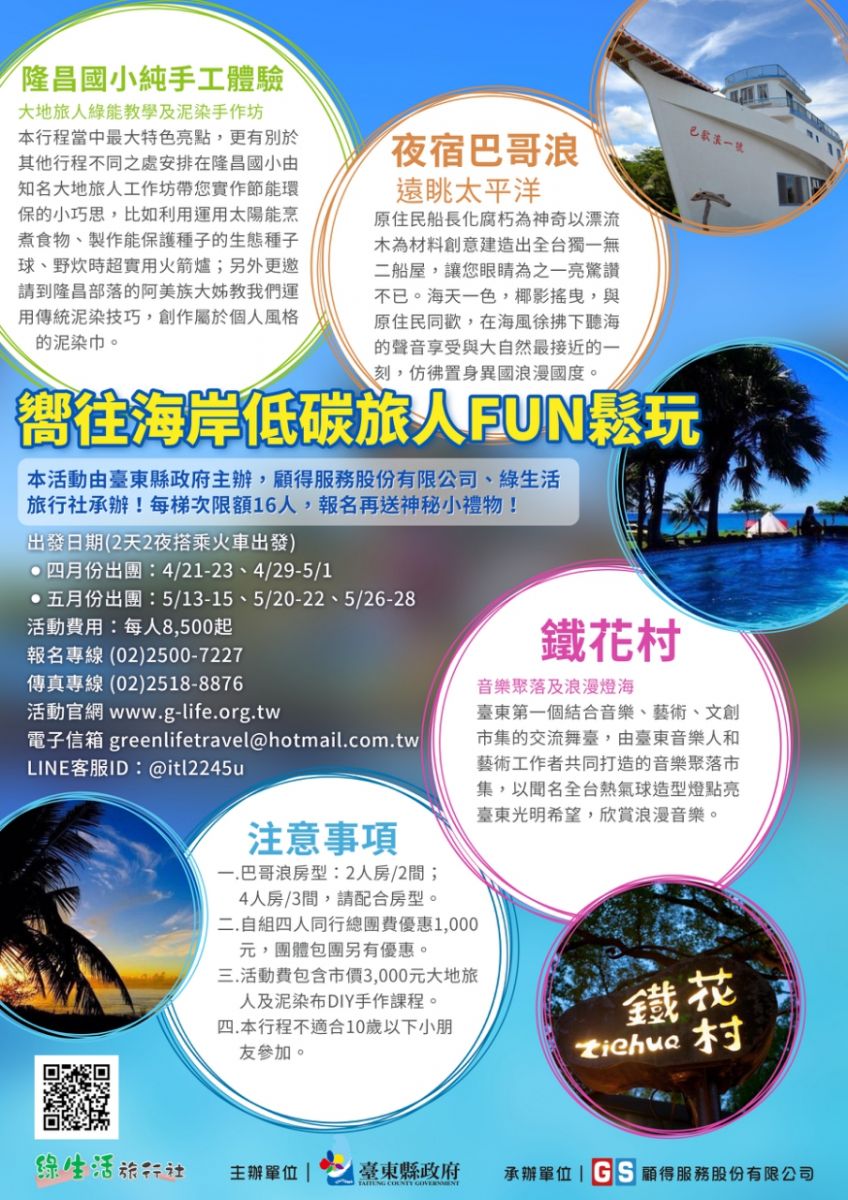 嚮往海岸低碳旅人~FUN鬆趣(搭火車保證出團)預約專線02-25007227來電告知想報名此行程