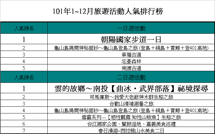 101年1~12月旅遊活動人氣排行出爐嚕~