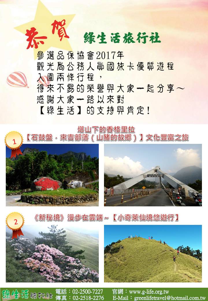★★★ 快報~恭賀【綠生活旅行社】行程經品保評選為2017年『國旅卡推薦優質行程』1.《新秘境》漫步在雲端~【小奇萊】仙境悠遊行 2.塔山下的香格里拉~【石鼓盤‧來吉部落(山豬的故鄉)】文化豐富之旅