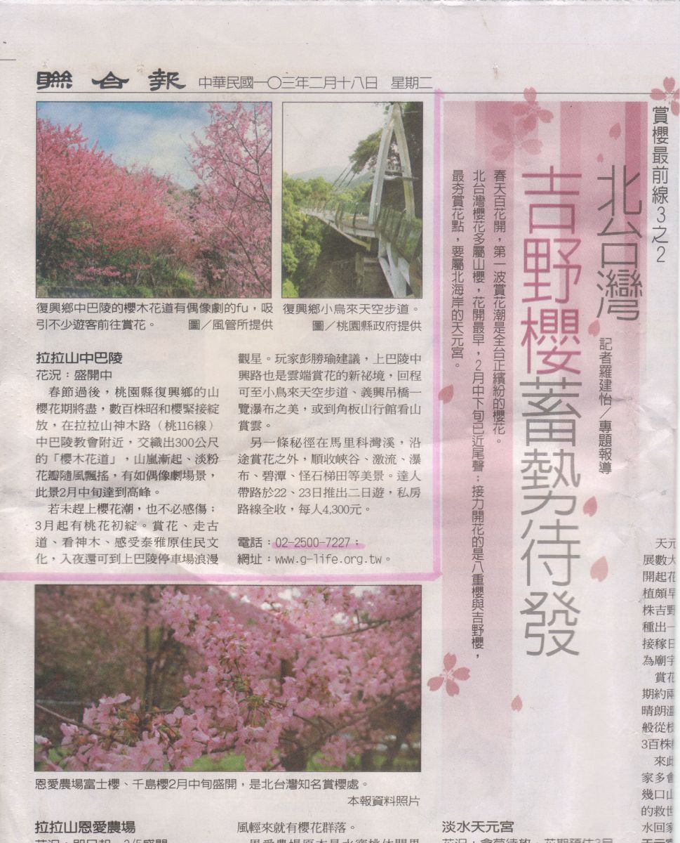 2014-01-18聯合報報導-賞櫻不用上武陵~馬里科灣溪探秘.拉拉山中巴陵賞櫻趣