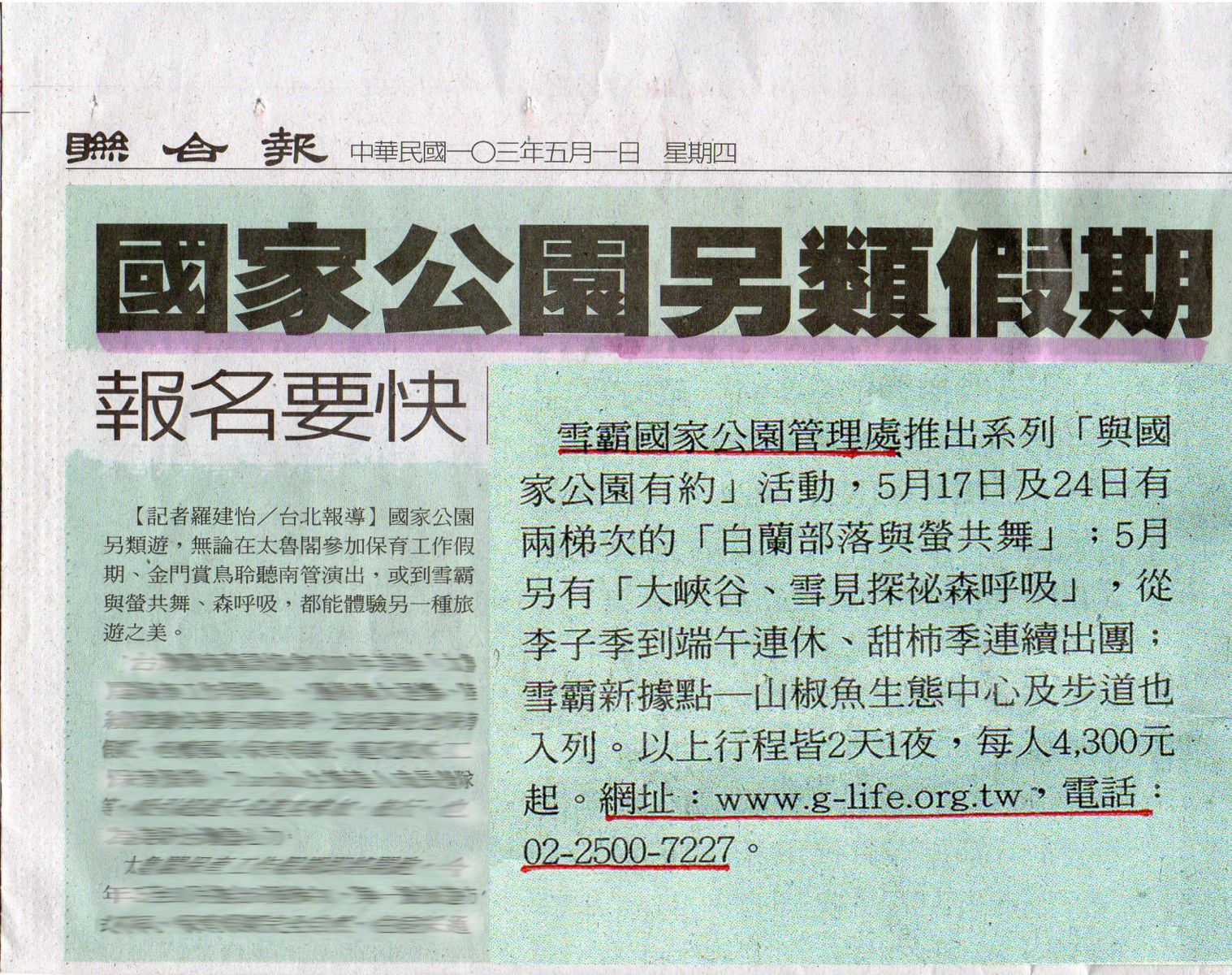 2014.05.01聯合報報導-國家公園另類假期