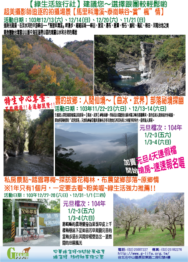 【2015年度~新年新希望~~4天元旦強檔,歡迎轉寄廣邀好友】★ 元旦FUN4連假【綠生活】建議您~選擇輕鬆跟團較輕鬆喲~