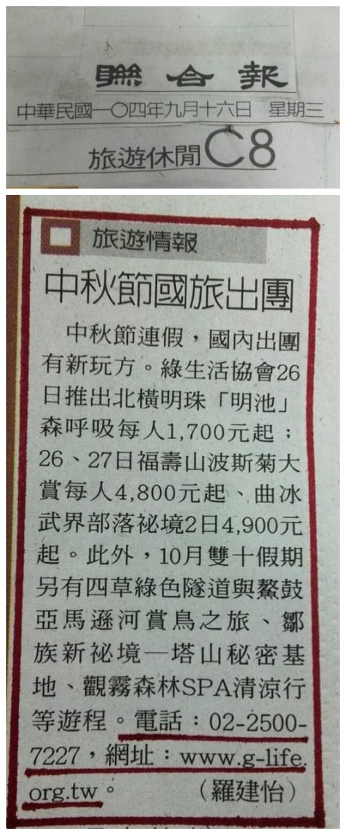 9/16聯合報 旅遊休閒媒體報導今天的聯合報有我們綠生活唷~ 活動最新消息104年9月16日(三)