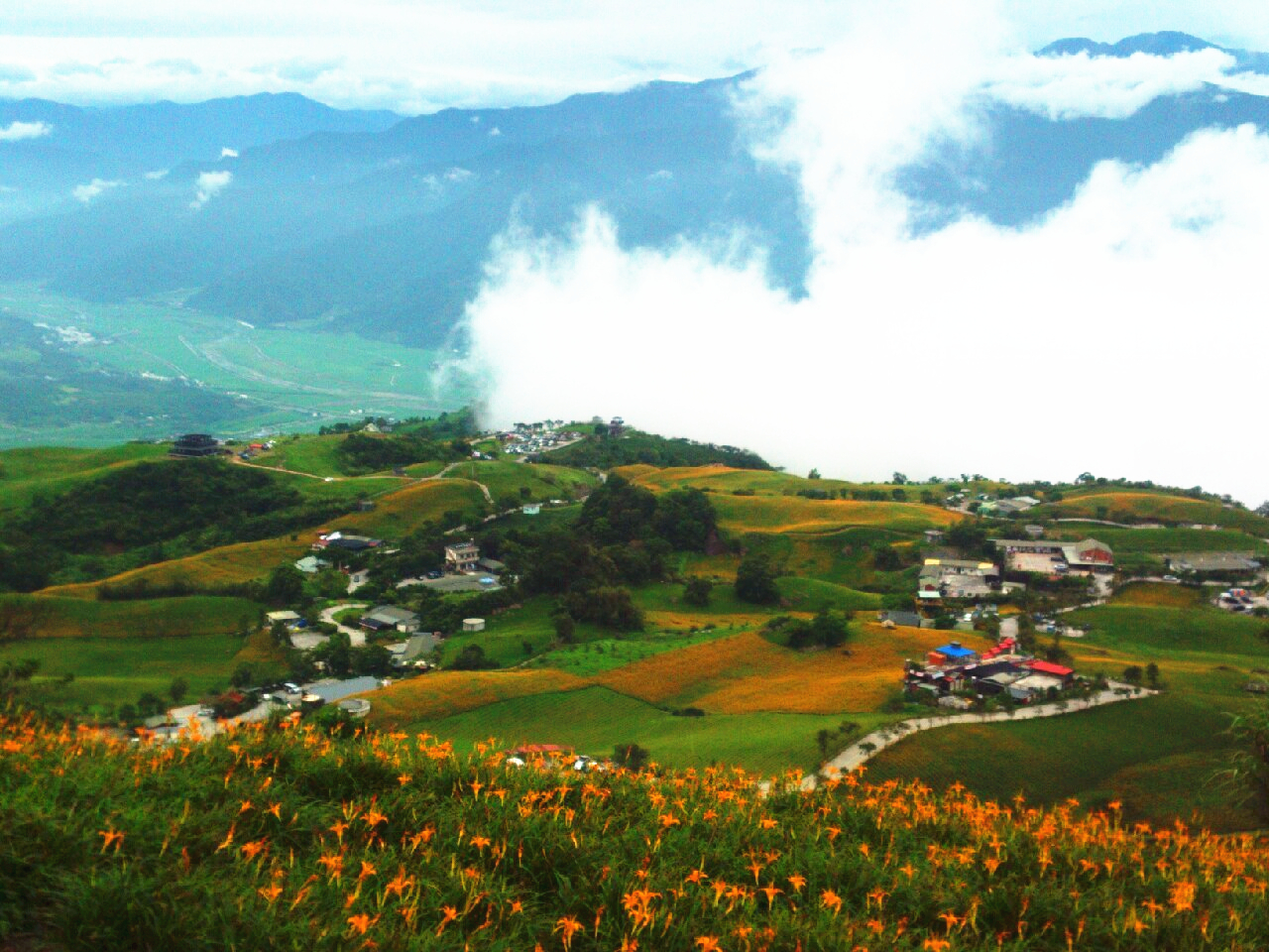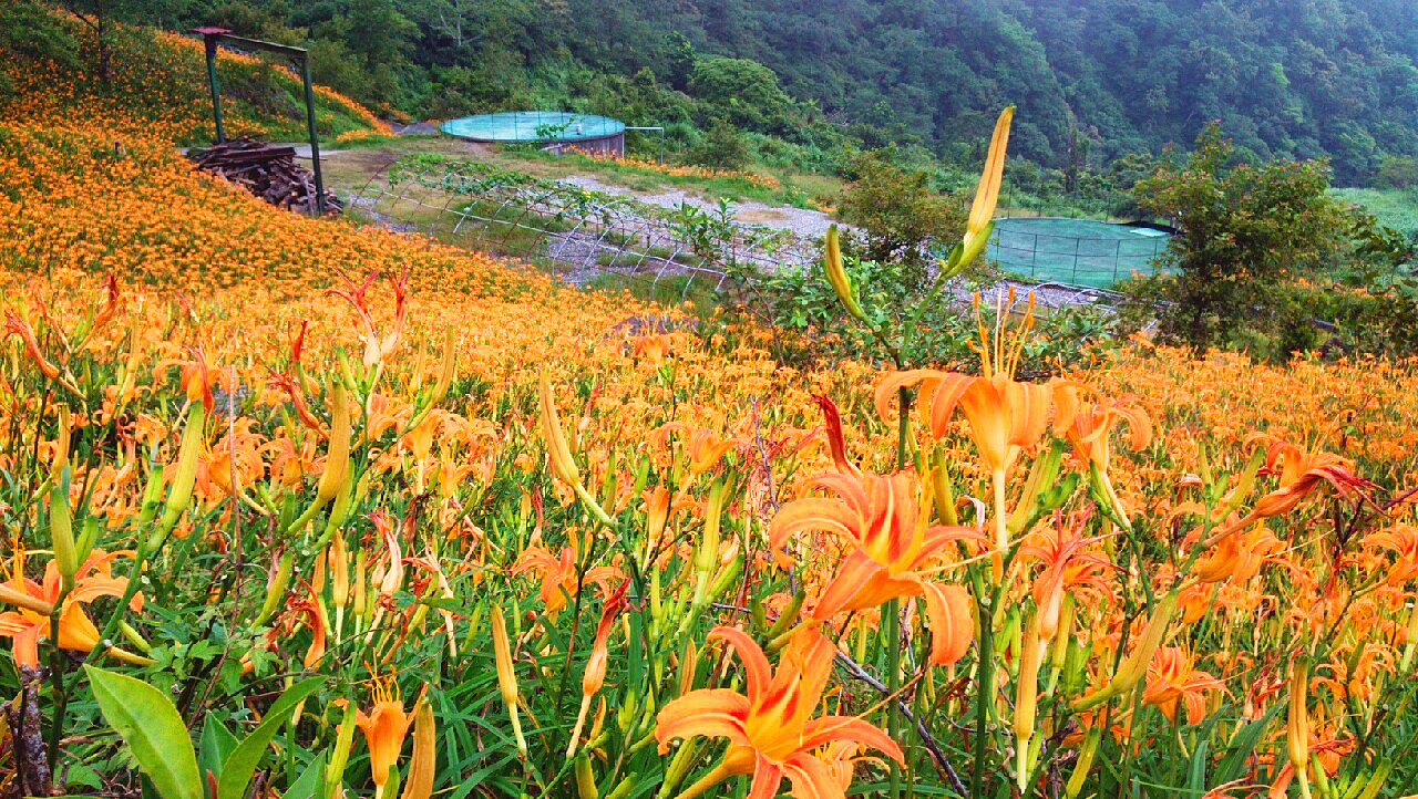 一片片無邊無際的金針花田,有如一張張碧綠的毛毯綿密地舖蓋在一重又一重的山嶺上,幾戶頂著紅瓦的農舍散置在綠意盎然的田間,形成一幅美不勝收的樸質風情。