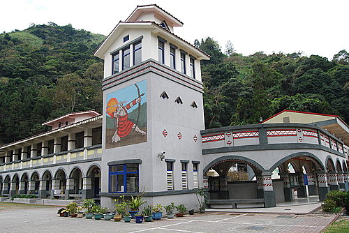 在不同角落有著可愛的彩繪,校園超滿的賽德克族的圖騰裝飾,背後依著山,