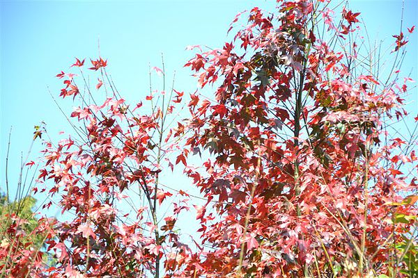 楓香、尖葉槭等為主,目前轉色程度依區域不同已達2成,43k遊客服務