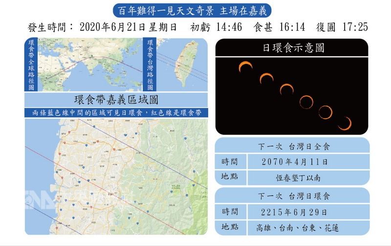 2020年夏至台灣將出現日環食,全程2小時39分鐘, 14:39,16:13,17:25分別是此次日環食初虧、食甚、復圓的時間點。 帶著太陽濾鏡,享受這難得一見的天文特徵。 2020年6月21日 台灣天文界的大事— 日環食 即將到來, 究竟是應該稱作“日食” 還是”日蝕” 呢? 有些人將日食稱為日蝕,如果叫做"日蝕" 這個"蝕" 變成侵蝕、腐蝕之義? 其實日食的食是吃的意思,源自古代民間傳說“天狗食日” , 是太陽被天狗吃掉一口,所以應該稱為“日食” 才是正確的喔。 【何謂日食,如何發生的?】 日食指的是月球運行到太陽和地球之間,並擋住了全部或部分太陽的現象, 此時地、月、日三者連成一線。 日環食:月球從太陽的正中央經過,但並沒有完全遮住太陽。 因為月球繞地球的軌道和地球繞太陽的軌道皆為橢圓形, 因此月球和地球、地球和太陽之間的距離並非永遠相同,而是時近時遠。 當月球距離地球較遠,食甚時,月球無法將太陽全部遮住,而剩下一個圓圈,就成為了所謂的『日環食』。 上一次台灣發生日環食是在2012年05月21日,這次是發生在2020年06月21日, 而下一次要在台灣看到日食就要等到200年了! 因此2020年的日環食堪稱是台灣人此生必看的天文奇景一點也不為過。 【2020年台灣嘉義日環食的發生過程與時間地點資訊】 想要看到日環食,必須要在環食帶通過的區域才能看到, 2020年「夏至」台灣將出現日環食,環食帶的正中央剛好通過嘉義。