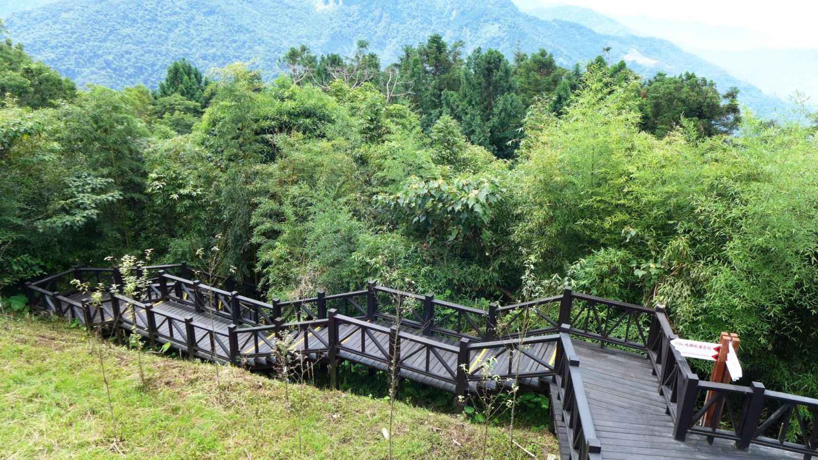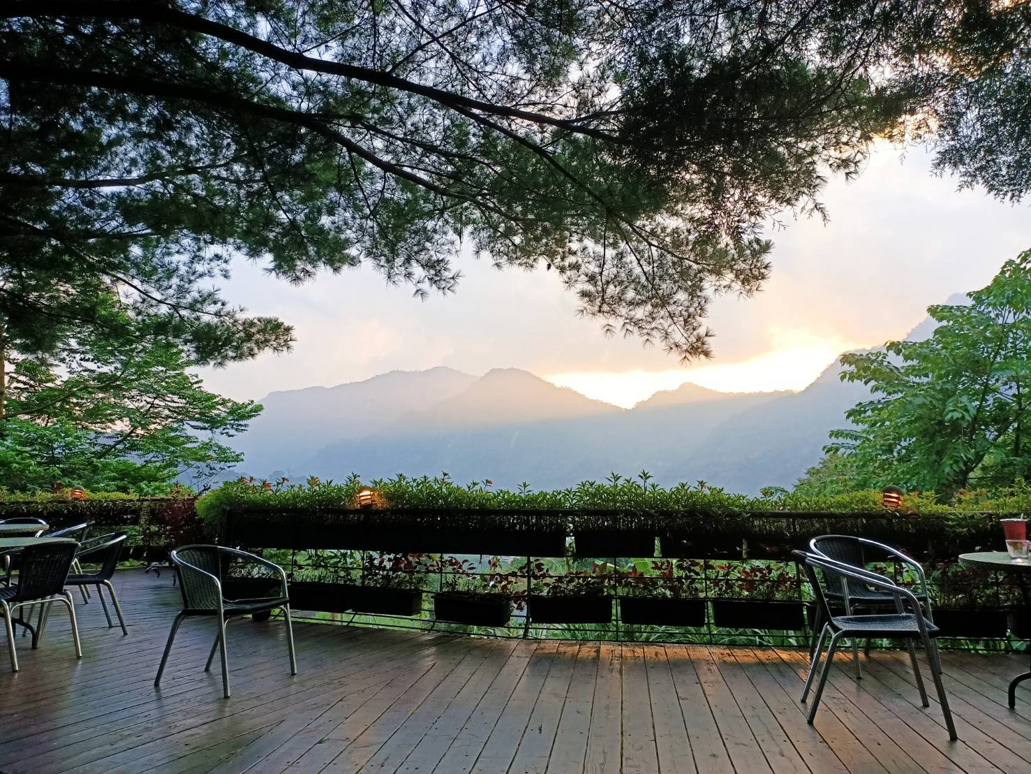 園區內數顆原生種的五葉松巨木,在泰雅高腳屋陪襯之下更增添部落風情,咖啡平台上眺望
