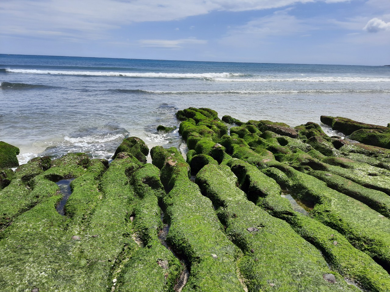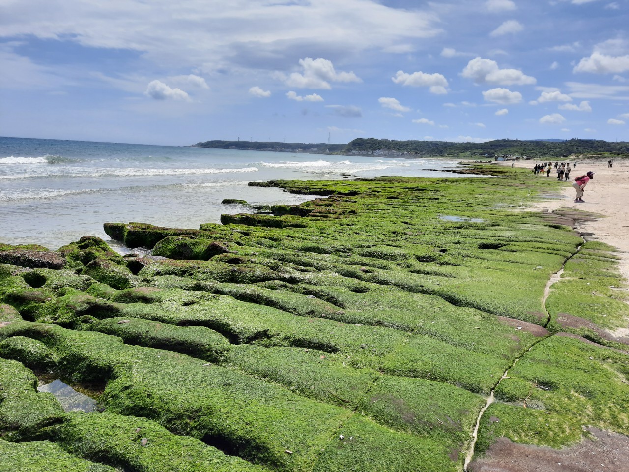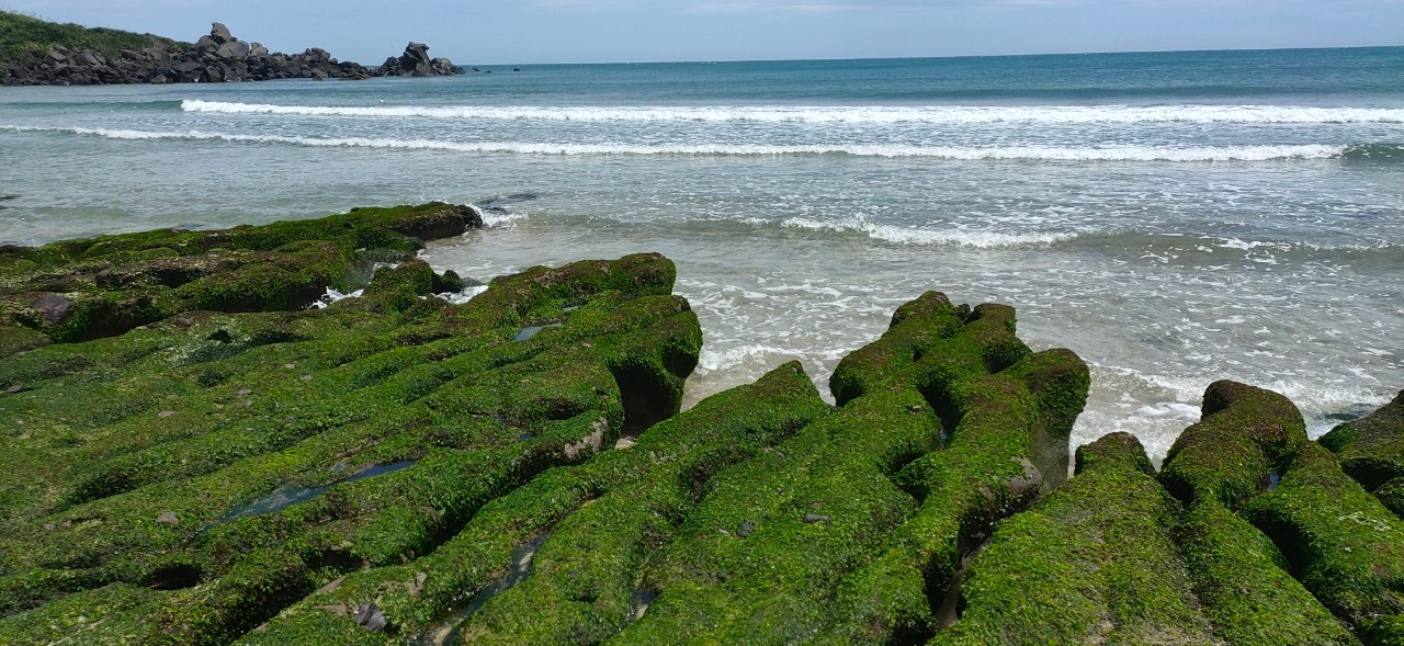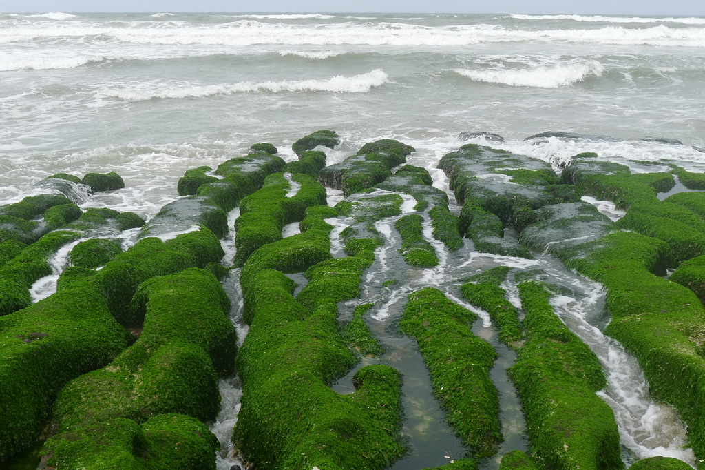 綠色的海藻,等到四月份東北季風漸歇,石槽就長滿了一大片綠色的海藻,也形成令人驚嘆不已